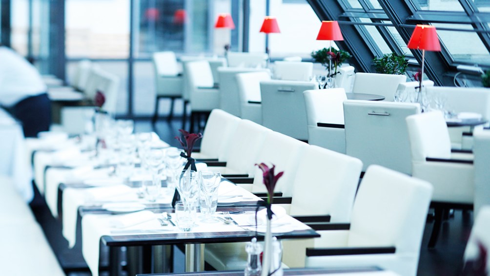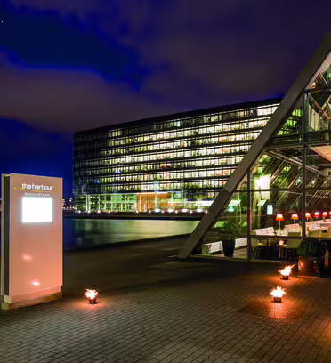 Bak den sluttande glasfasaden ligger hotellets restaurang, The Harbour Breakfast Restaurant, där du kan börja dagen med frukost alldeles intill hamnfronten.