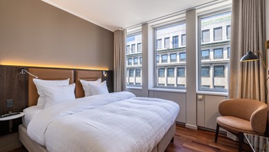 Bakom fasaden väntar 268 rum i stilren nordisk design, med luftkonditionering, kvalitetssängar och genomtänkta detaljer som skapar en rofylld miljö både för arbete och avkoppling. Från tidig morgon till sen kväll finns det plats för njutning. Börja dagen i vår frukostrestaurang där varma toner och doften av nybakat bröd och nybryggt kaffe sätter stämningen.